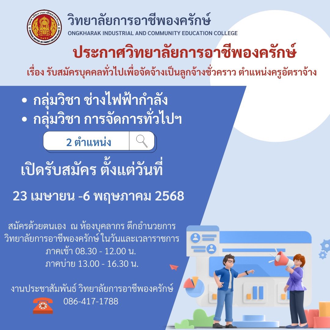 วิทยาลัยการอาชีพองครักษ์ เปิดรับสมัครคัดเลือกบุคคลทั่วไปเพื่อจัดจ้างเป็นลูกจ้างชั่วคราวตำแหน่ง