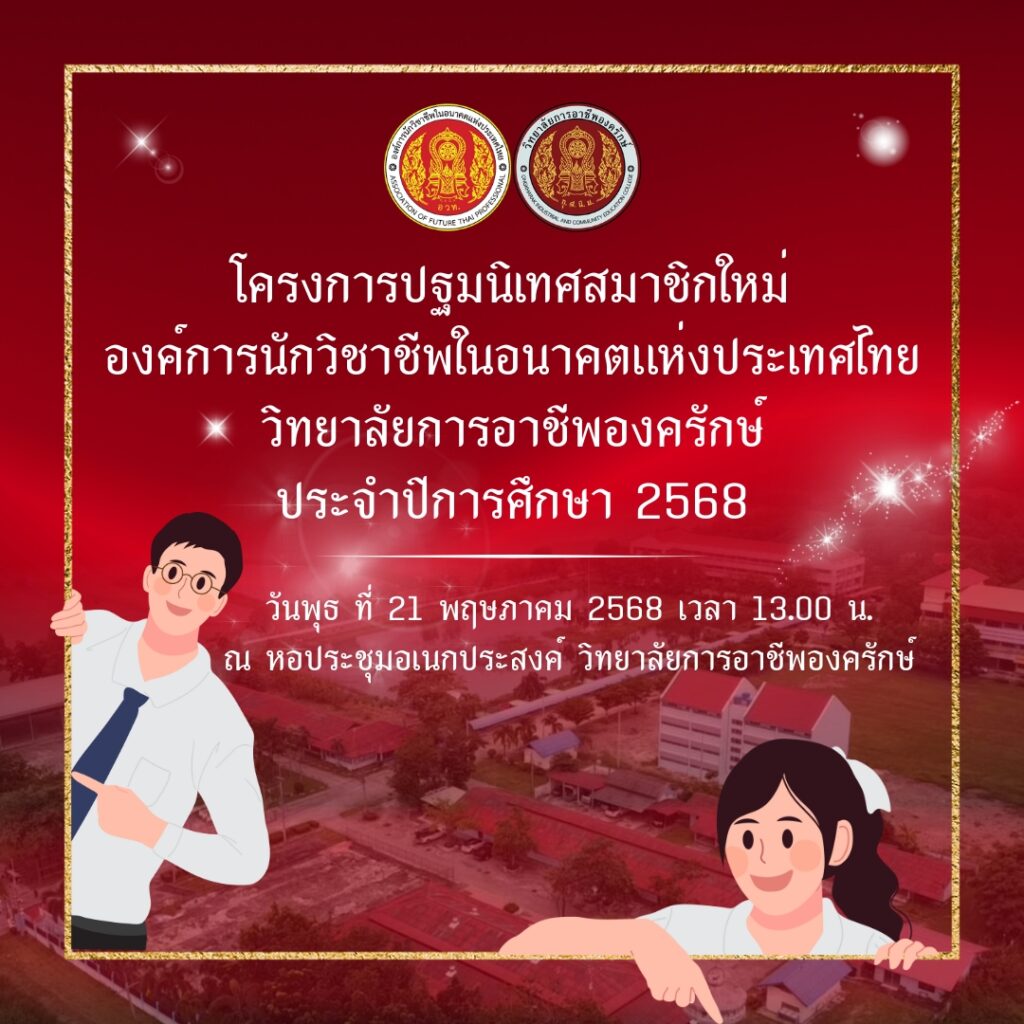 งานกิจกรรมอวท. โครงการปฐมนิเทศสมาชิกใหม่ องค์การนักวิชาชีพในอนาคตแห่งประเทศไทย ประจำปีการศึกษา 2568 16 พฤษภาคม 2025 Admin_ongkharak ประชาสัมพันธ์ เชิญชวน นักเรียน นักศึกษา เข้าร่วมโครงการปฐมนิเทศสมาชิกใหม่ องค์การนักวิชาชีพในอนาคตแห่งประเทศไทยวิทยาลัยการอาชีพองครักษ์ประจำปีการศึกษา 2568วันพุธ ที่ 21 พฤษภาคม 2568 เวลา 13.00 น.ณ หอประชุมอเนกประสงค์ วิทยาลัยการอาชีพองครักษ์